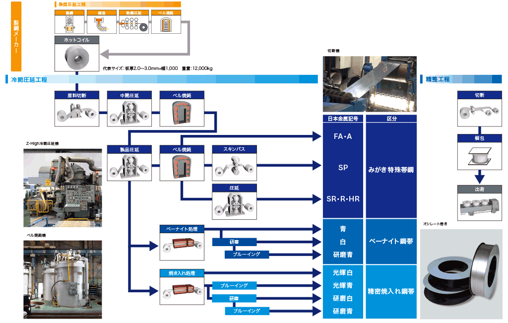 みがき特殊帯鋼の生産を始めたのは1930年。わが国で最も古い歴史を有しています。以来、一貫冷間圧延の専門メーカーとして、たゆまざる研究と技術の錬磨を重ね、その品質は高い評価を得ています。販売においても国内はもちろんのこと、広く世界に輸出しています。あらゆる部門の、いかなる仕様、数量にも応えることをモットーに、高品質製品を提供しています。