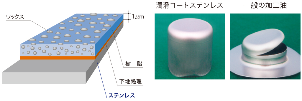 完全無塗油でのプレス加工が可能で、加工油を使用した時よりも良好な加工性を示します。また、金型寿命が向上し、バリ高さが軽減されるため、精密部品にも適用が可能です。